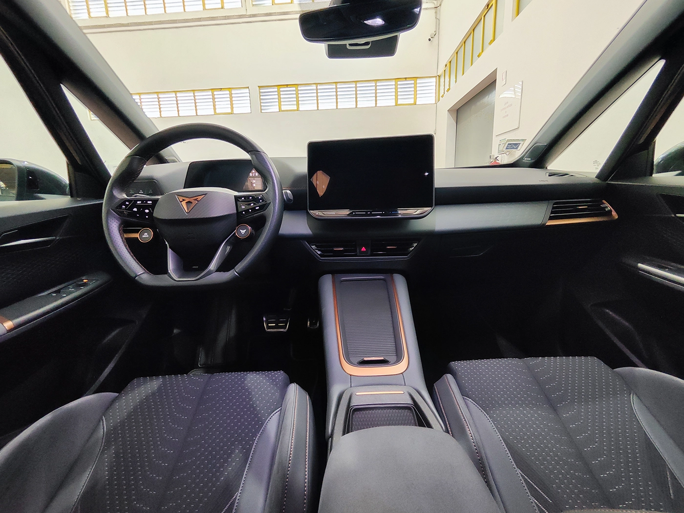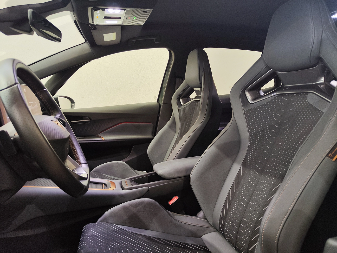O interior apresenta um ambiente premium e tecnológico, com ecrã tátil de 12,9”, cockpit digital, bancos desportivos CUP Bucket e iluminação ambiente, garantindo conforto e inovação em todas as viagens.
